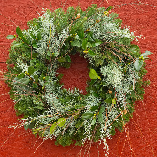 Using curated fresh local greens, the Budded Iced Birch wreath brings a beautiful blue composition to your front door with Budded Camelia, Blue Ice Cypress, Birch Branches, and Noble Fir. This is a great hostess gift or a special Oregon treat for out-of-state friends & family. Wreaths can be shipped anywhere across the country straight from our farm.